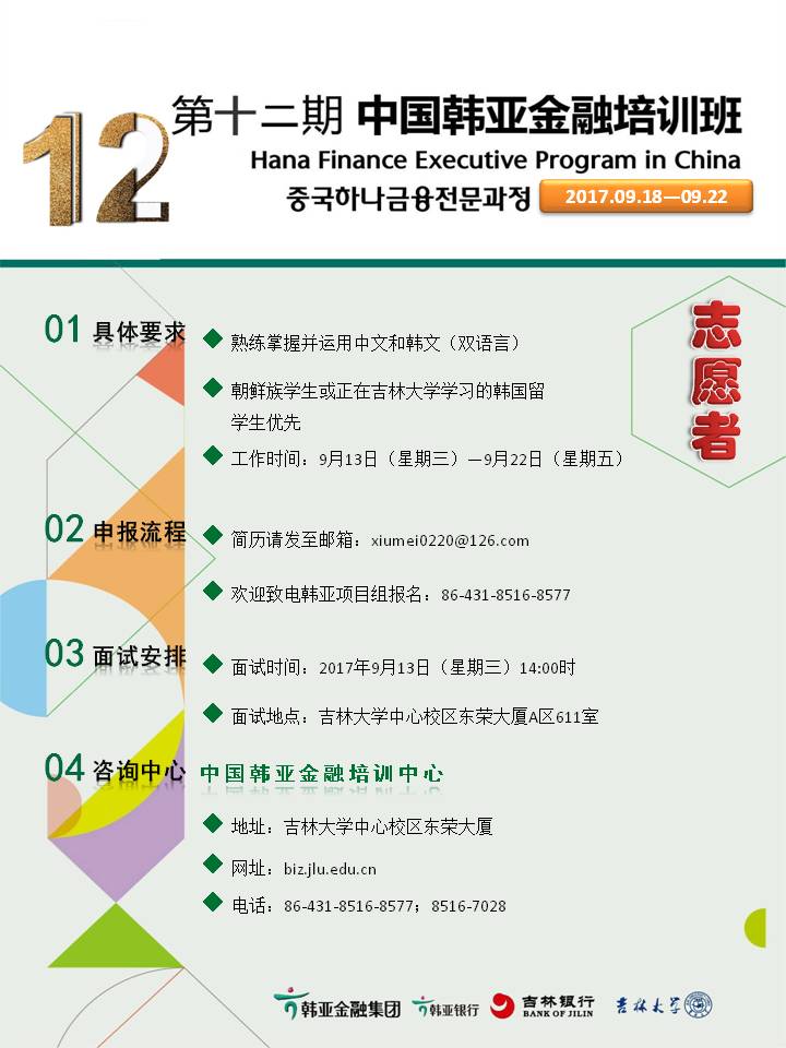 第十二期中国韩亚金融培训班将于2017年9月18日正式开始,现面向各位同学招募志愿者。具体要求如下: